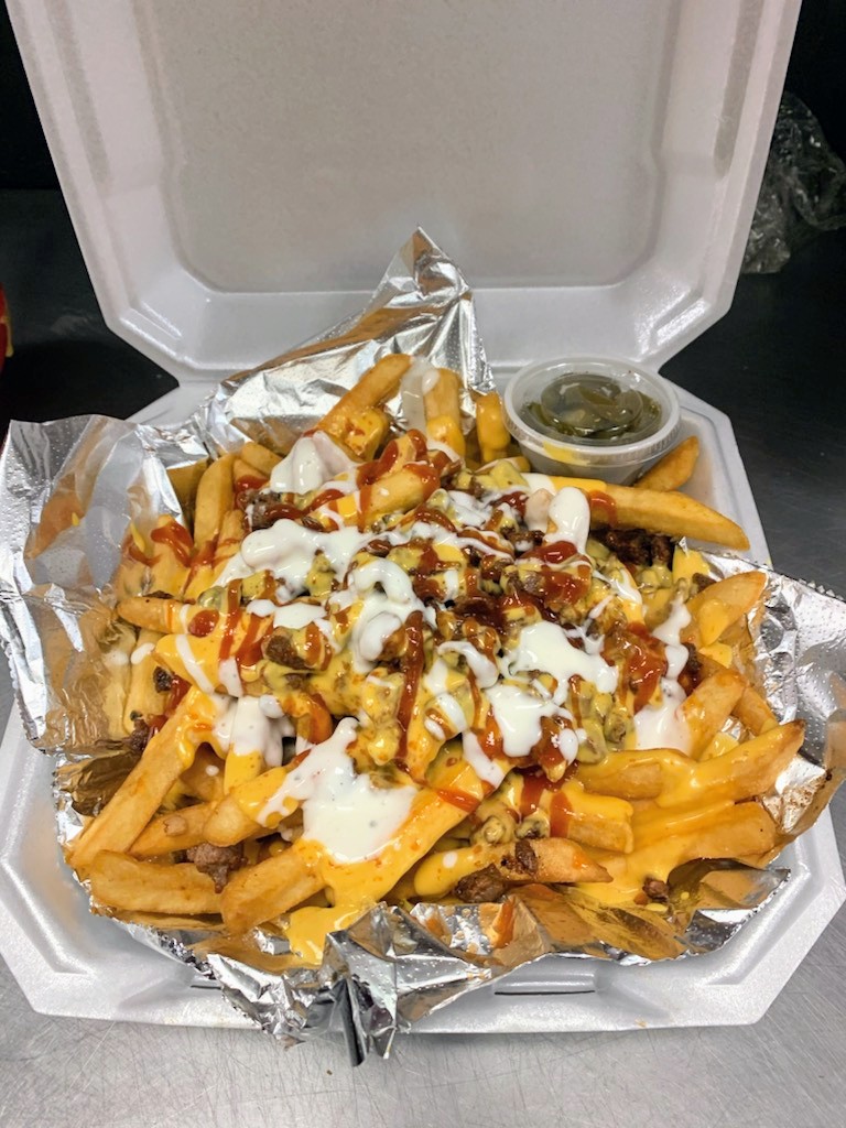 Que' Fries French Fries with Buffalo Sauce Ranch and Ketchup on Top