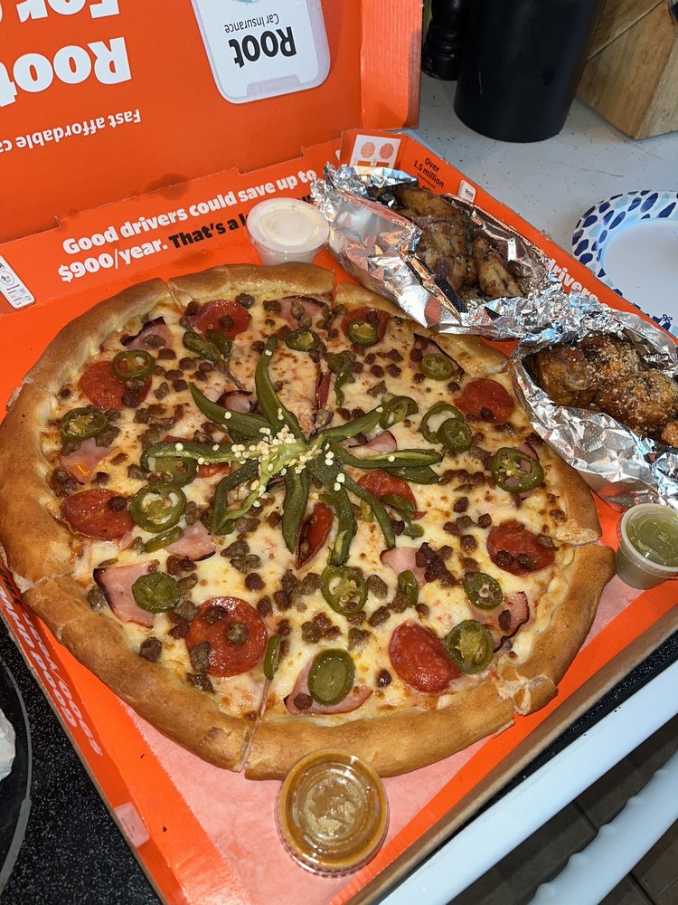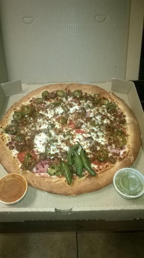 Pepperoni, Canadian bacon, sausage, chorizo, jalapenos and extra cheese.