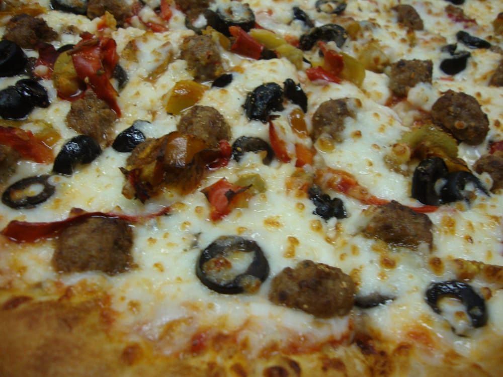 Pepperoni, Canadian bacon, beef, sausage, mushroom, bell peppers, black olives, onions and extra cheese.